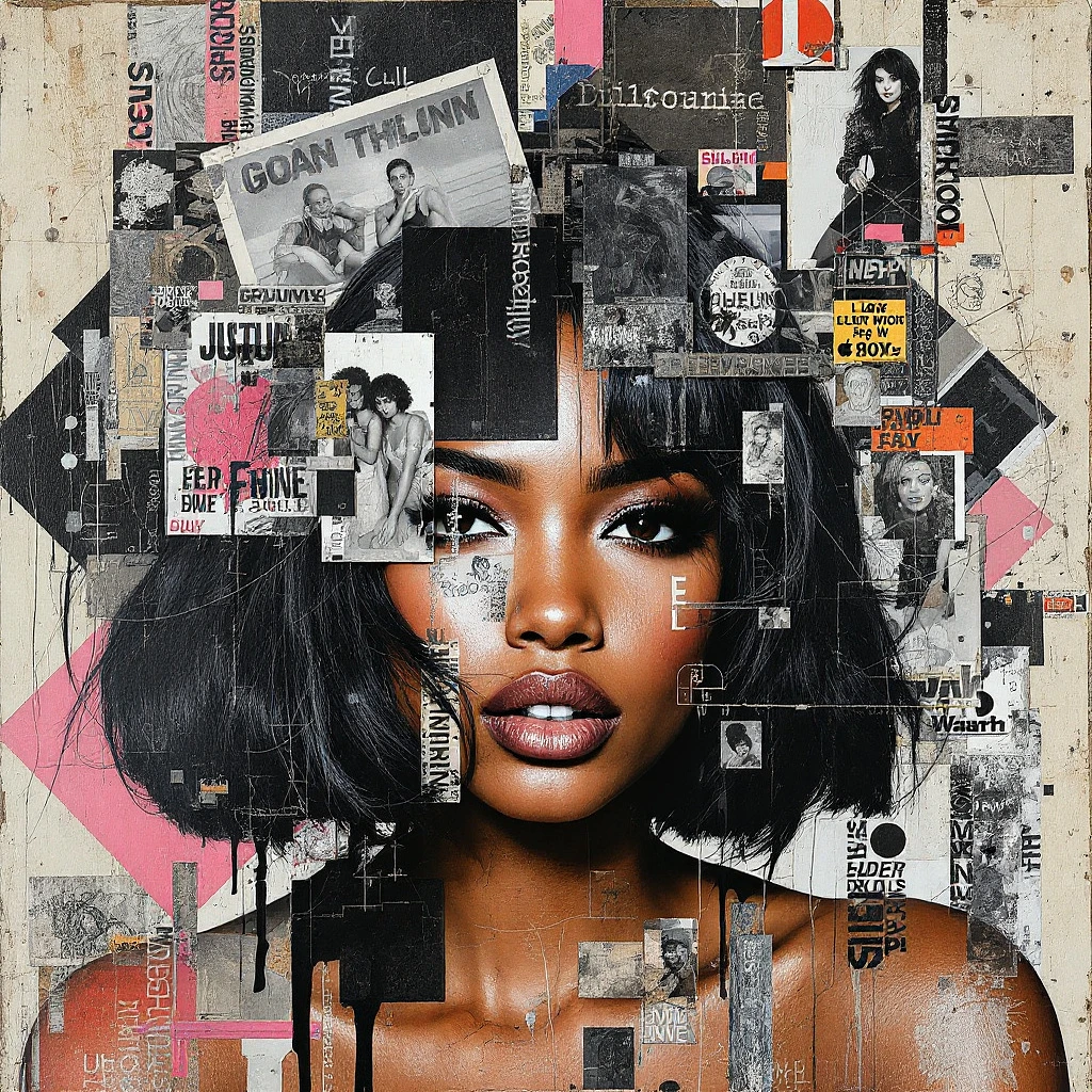 woman with black hair, brown skin in the style of multi-layered collages, edgy street art, celebrity-portraits, cardboard, fragmented icons, realistic hyper-detail, crossed colors --ar 73:111 --stylize 750 --v 6