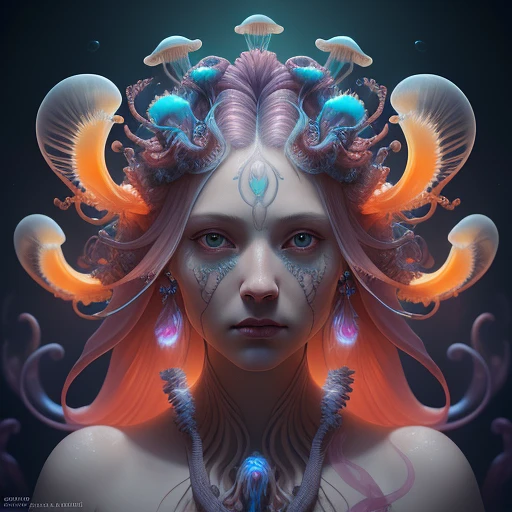 Goddess close-up portrait ribcagel. jellyfish phoenix head, nautilus, orchid, skull, betta fish, bioluminiscent creatures, intricate artwork . octane render, trending on artstation, t symmetrical artwork. cinematic, hyper realism, high detail, octane render, 8k
