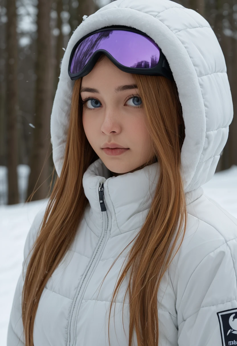 Fairy tale Create a hyper-realistic digital image of European stunny girl personified as a strikingly beautiful yet formidable villain, [Edgy medium fashion photo] + [Model wearing a white puffer jacket with subtle quilting, oversized dark teal faux fur hood, reflective ski goggles with a purple gradient lens, and bright yellow quilted gloves with exaggerated padding. The textures of the outfit are luxurious and bold, creating a winter-sport-inspired aesthetic.] [Female model with wet-effect blond curly hair framing her face, neutral expression, intense gaze.] [Style: High-fashion winterwear by Millet, inspired by contemporary alpine sportswear.] [Location: snow mountain.] [Lighting: DARK light, emphasizing texture and materials.] [Camera: Fashion photography with Canon EOS 5D Mark IV.] [Details: Hyperrealistic details, polished textures, sharp focus on materials and accessories.] --v 6. 1