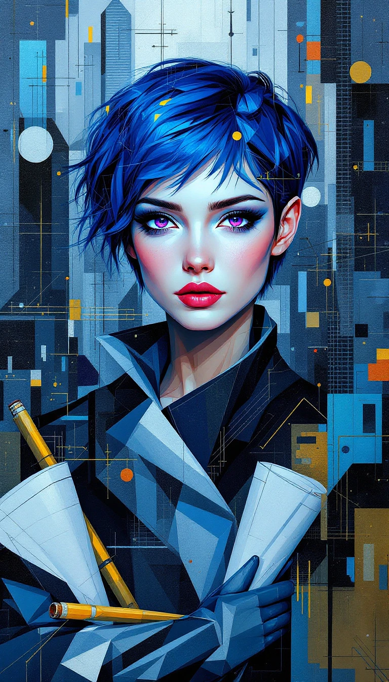 "Indigo Architect in a Shifting City": A mesmerizing abstract painting showcases an architect, with a blend of innovation and a touch of mystery. She is a skilled creator, presented in a city that seems to shift and change, with a fair complexion, short, vibrant indigo hair styled in a geometric and precise cut, and a practical outfit with bold, angular lines. Architectural tools and blueprints are held in her hands and are interwoven into her attire. The artwork masterfully combines modern abstract techniques with a portrait, using a dynamic palette including blues, silvers, and blacks. Her focused, violet eyes, the composition’s focal point, convey a sharp intellect and a visionary sense of design. After a long day of construction and innovation, the architect embodies both precision and a passion for creating the world around her. The sharp lines and shifting perspectives invite the observer to explore the hidden stories within this vibrant artwork, presented as a painting.