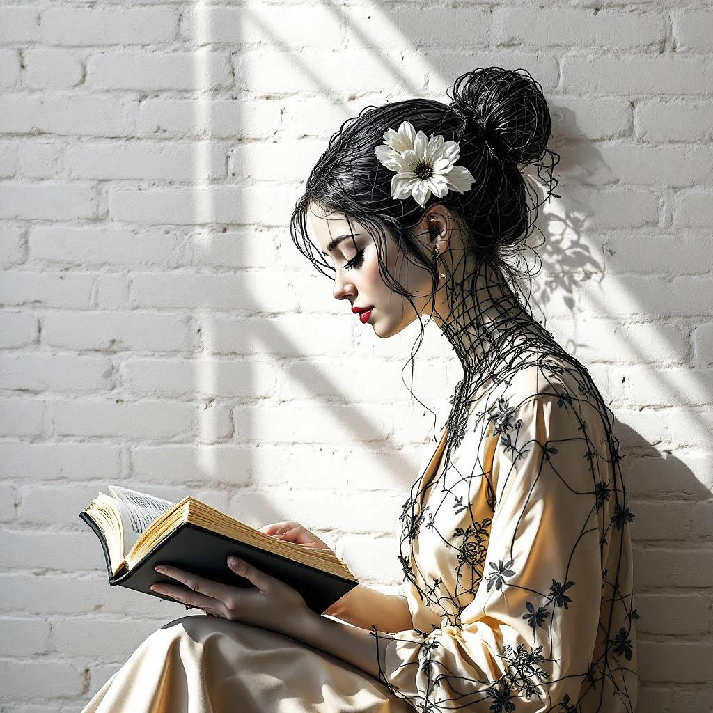 poetic hyper-realistic wall sculpture in black metal wire, depicting a graceful woman reading a book. minimalist single-line art style, mounted on a softly lit white brick wall, cinematic light and shadow, emotional and elegant atmosphere, fine art photography aesthetic.