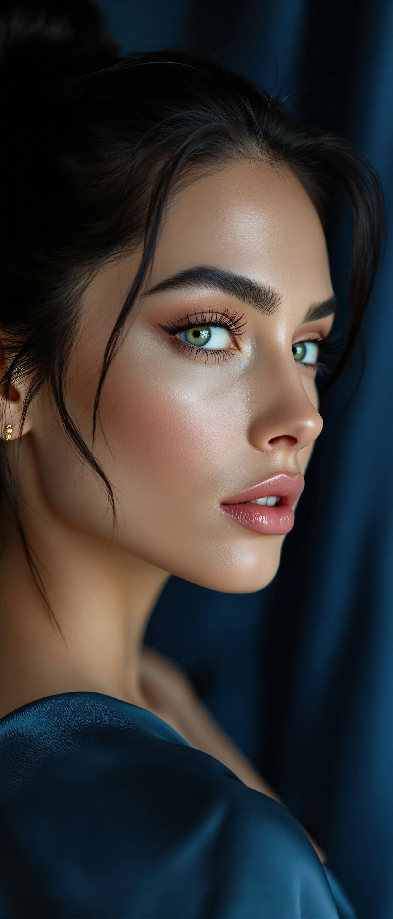 "A cinematic style fine art photograph, with gentle, soft light and soft pastel colours, features a close-up head and shoulders portrait of a supermodel in her early 20s. head tilted slightly left, Her luminous complexion is sculpted by Rembrandt lighting. She has raven black hair in a bun, vivid green-silver eyes turned to her right looking into camera, full parted pink lips. A navy blue silk backdrop offers harmony, with a muted golden rim light adding depth. The diffused shadows, subtle illumination, and soft contrast create a serene, confident mood. Photographed with a Sony A1 and 120mm lens for high resolution and an editorial style. "
