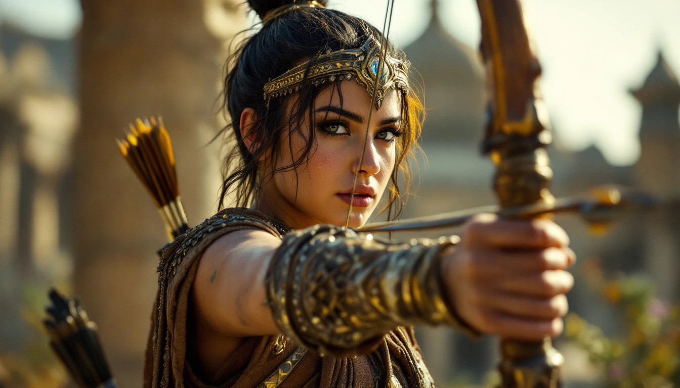 Ultra-realistic. Medium shot of Yutab nocking an arrow in her bow, her breathing calm and focused. [Yutab: Achaemenid Persian archer attire, steady hands, no helmet for better visibility