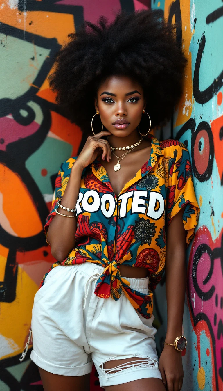 An intensely detailed, almost painterly portrait of a free-spirited African-American woman. She poses against a wall covered in dynamic, Afrocentric graffiti, wearing a loose, vibrant shirt with bold patterns and the word ‘ROOTED’ alongside comfortable shorts. Her bold, statement jewelry and relaxed posture evoke a sense of effortless coolness and self-expression. The photograph has an artistic feel, blending the energy of street art with influences from abstract painting and contemporary fashion. It’s a captivating representation of urban style with a distinctive cultural flair.