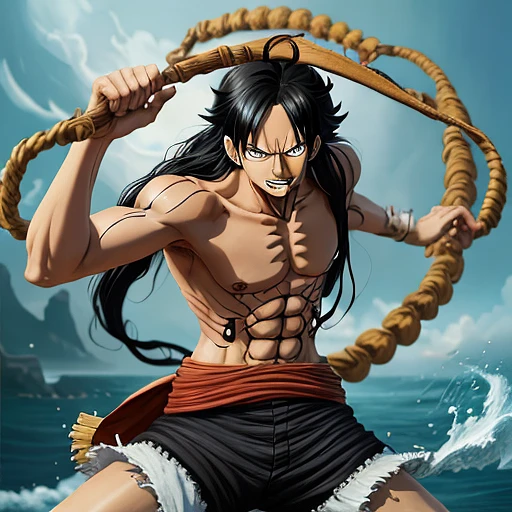 Luffy, gear five, one piece theme, uhd image, precisionist art, character illustrations --ar 71:130 young man with long black hair