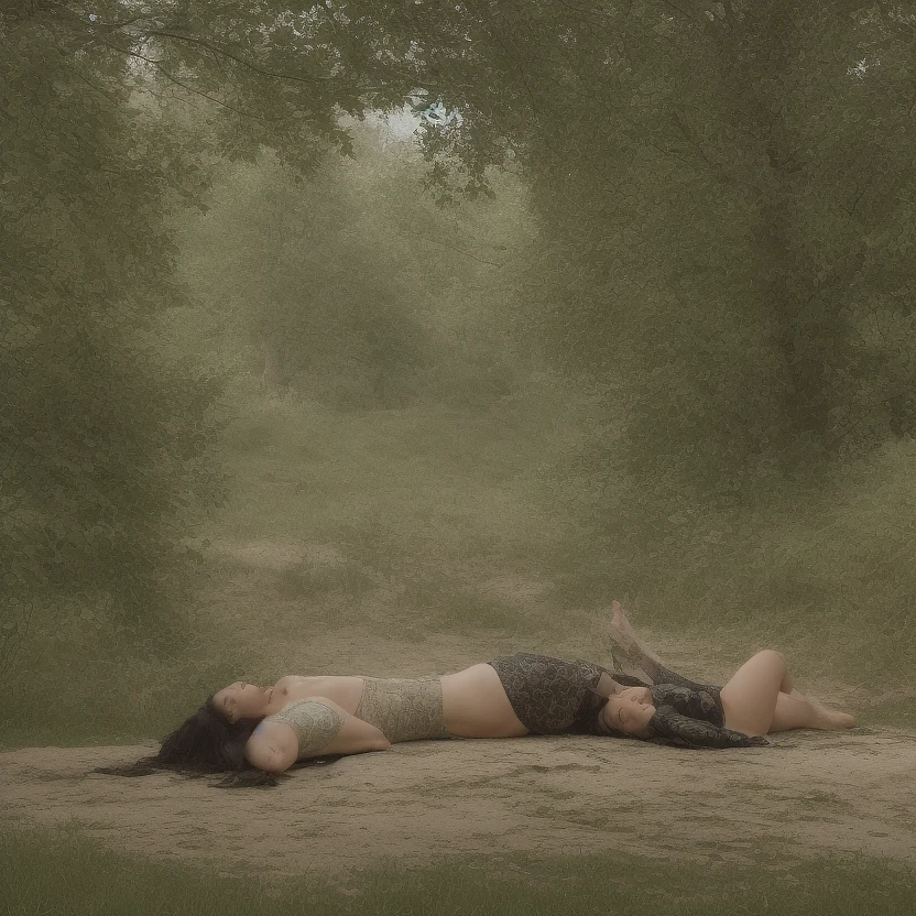 Two beautiful, Middle Eastern women, lie together, in a serene glen beside a tranquil lake. Both lie on the grass kissing. Each wears intricately detailed black, gold and silver leather and crystal tops and bottoms, accentuating their curves. Their embrace exudes minimalist elegance amidst soft, even lighting.
