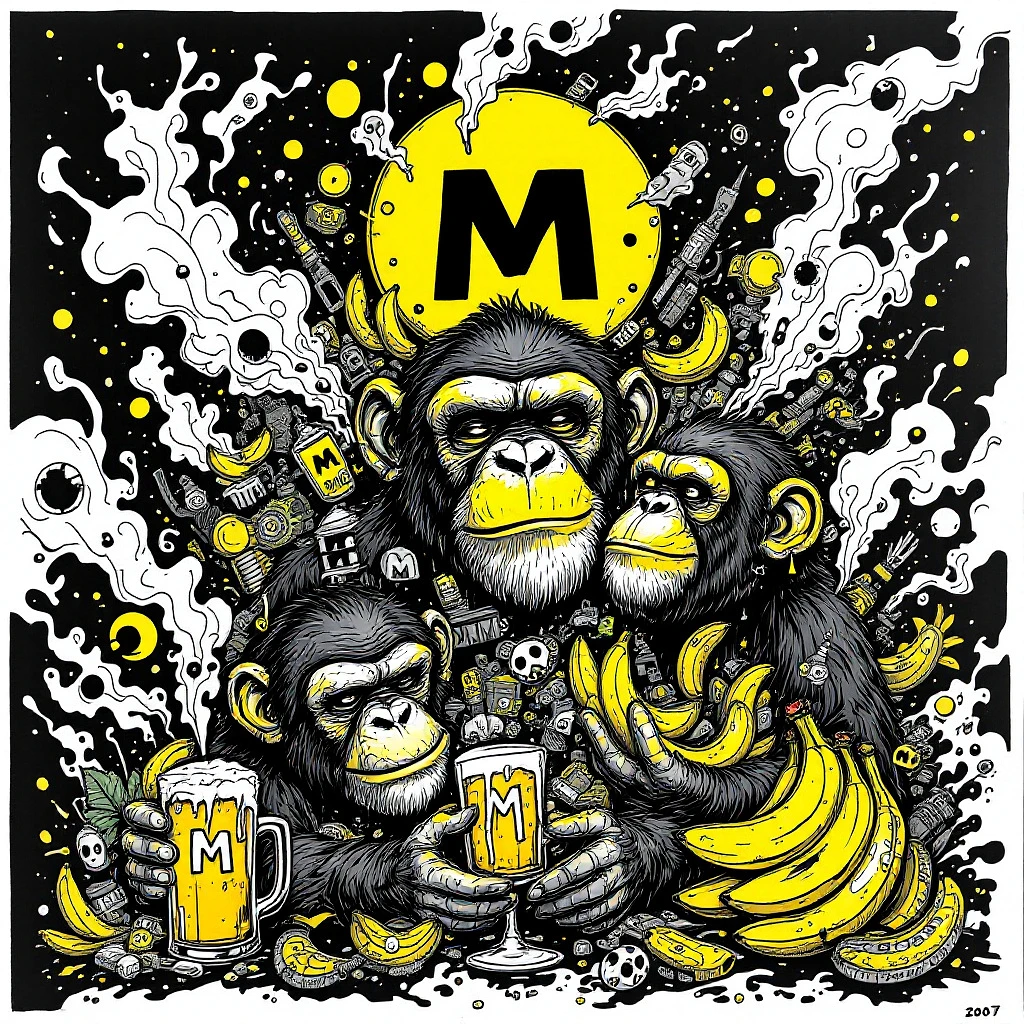 An intricate and mainly black, white, yellow, green, (two contrasting, extra colors for details) , graffiti-style poster featuring various elements, such as cartoon characters, symbols of urban culture, smoke and dynamic expressions, focusing on minimalistic chimp faces, the letter 'M' inside a large circle, bananas, beer, is part of the image. the word and '2007' is hidden --ar 63:128 --stylize 750