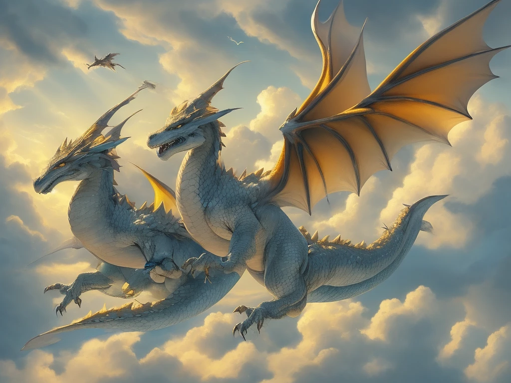 Two magnificent dragons fly through the air around, their scales glinting like diamonds in the light. The background of the image is a dramatic cloudy sky, with a brilliant yellow sun shining through the clouds like a beacon of hope.