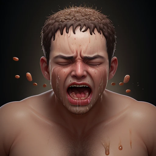 A full grown male coming out of melted cheese screaming and crying with beans on his head with long nipples, trending on artstation, t symmetrical artwork. cinematic, hyper realism, high detail, octane render, 8k