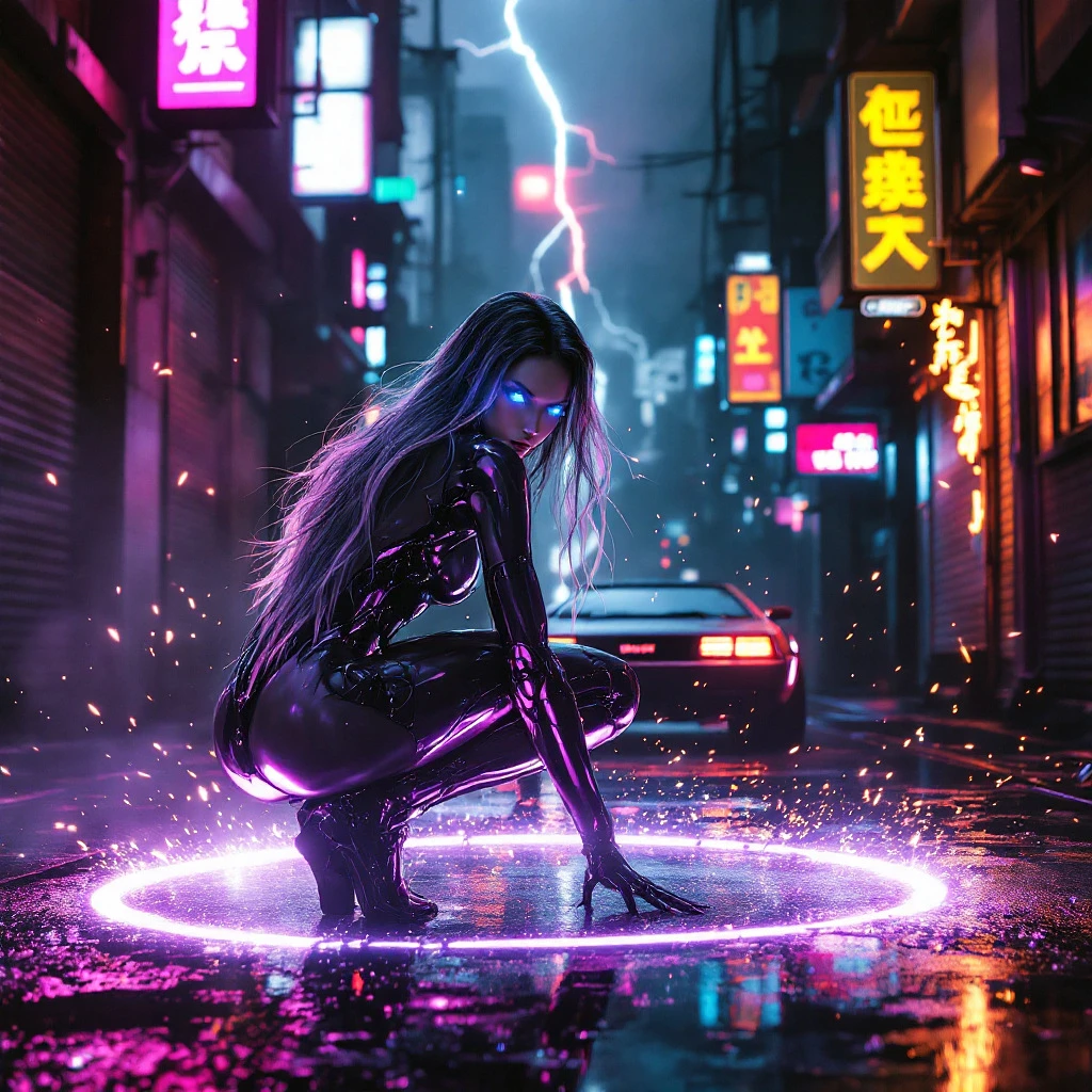 A hyperrealistic 8K cinematic masterpiece blending the gritty, neon-soaked aesthetic of a cyberpunk 1980s Tokyo alleyway with the intense action of a high-tech, futuristic battle. The scene unfolds in a dark, chaotic urban sprawl, alive with swirling fog and flickering neon lights that cast erratic, vivid glows of pink, blue, and fiery amber onto weathered brick walls and reflective puddles on the wet pavement. In the foreground, a stunning female android combatant crouches within a glowing circle of light, her sleek metallic body rendered with intricate, photorealistic detail. Her long, flowing hair moves as if caught in a gentle breeze, illuminated by particles of light and fiery sparks from a massive electrical discharge behind her. Her piercing blue glowing eyes lock onto the viewer with an aura of unrelenting power and readiness, embodying the fusion of elegance and lethal precision. Beside her, an iconic DeLorean, a symbol of retro-futuristic design, stands amidst the chaos, under siege by two hovering attack helicopters armed with M134 Miniguns. Streams of tracer ammunition pierce through the thick, swirling smoke, creating arcs of fiery destruction that illuminate the urban battlefield. The DeLorean's brushed silver metallic body gleams with reflected light from the surrounding neon signs, skyscraper silhouettes, and burning wreckage. Its taillights—one a fiery red and the other an amber hue—cut sharply through the haze, their reflections rippling across the puddles below. The surrounding environment is a tapestry of destruction and decay. Burning cars smolder in the distance, shattered glass and twisted metal scatter across the ground, while torn flyers cling to graffiti-covered walls. Overflowing dumpsters and rusted trash cans add to the dystopian atmosphere, complemented by the distant hum of sirens, the roar of helicopter engines, and the intermittent crackle of neon signs. A cracked neon sign reading "HEATWAVE" flickers erratically, illuminating the scene in pulses of vibrant energy. Volumetric lighting streams through the dense smoke, casting soft, diffused beams across the android’s gleaming body and the DeLorean’s muscular contours. Subtle reflections of nearby city lights ripple across the car’s angular lines, emphasizing its aggressive stance. The background cityscape looms, softened by the haze, with towering high-rises and distant neon signs peeking through the fog. The atmosphere is electric, alive with tension and visual intensity, as if pulled straight from an epic 1980s action-drama infused with high-tech cyberpunk fantasy. A hyperrealistic 8K cinematic masterpiece blending the gritty, neon-soaked aesthetic of a cyberpunk 1980s Tokyo alleyway with the intense action of a high-tech, futuristic battle. The scene unfolds in a dark, chaotic urban sprawl, alive with swirling fog and flickering neon lights that cast erratic, vivid glows of pink, blue, and fiery amber onto weathered brick walls and reflective puddles on the wet pavement. The alleyway is an oppressive portrait of urban decay: overflowing dumpsters with dented lids spill refuse across the ground, including torn garbage bags revealing rotting food and broken bottles. Murky, oily puddles form near rusted trash cans, reflecting the distorted neon signs above. A tattered "NO DUMPING" sign clings to a graffiti-covered wall near a massive, grimy, torn poster of a grinning model advertising a long-forgotten product. The air is thick with the smell of damp concrete, mold, and decay, immersing the viewer in this oppressive environment. Above the chaos, a cracked neon sign reading "HEATWAVE" flickers erratically, with letters inverted to resemble mirrored "3"s. The distorted lettering creates an unsettling effect as the buzzing neon tubes pulse in pink and blue. Sparks rain down from the broken sign, casting faint, glowing embers into the smoky abyss. Prominently in the foreground is a brushed silver DeLorean, its iconic lines covered with streaks of dirt and soot. The taillights glow red and amber, mirrored in the puddles below. On its license plate is the text “RED BEAR RAD, ” with "RAD" boldly emphasized in capital letters. In the middle ground, a terrified stray cat leaps from an overturned trash can, eyes wide in fear, its matted fur flying. Nearby, shadowy figures lurk—a hooded figure crouches behind a dumpster with a weapon, while another leans against the wall, half-hidden by the swirling smoke, radiating menace. In the distance, a small dog sprints away, tail tucked, disappearing into the foggy shadows. The focal point is an android combatant crouched in the heart of the alley, her sleek metallic body gleaming with precision under the flickering neon glow. Her piercing blue eyes contrast against the chaotic urban backdrop, where every detail—from the grimy textures to the luminous "HEATWAVE" sign—comes together in a vibrant, suspenseful cyberpunk universe filled with life and tension.