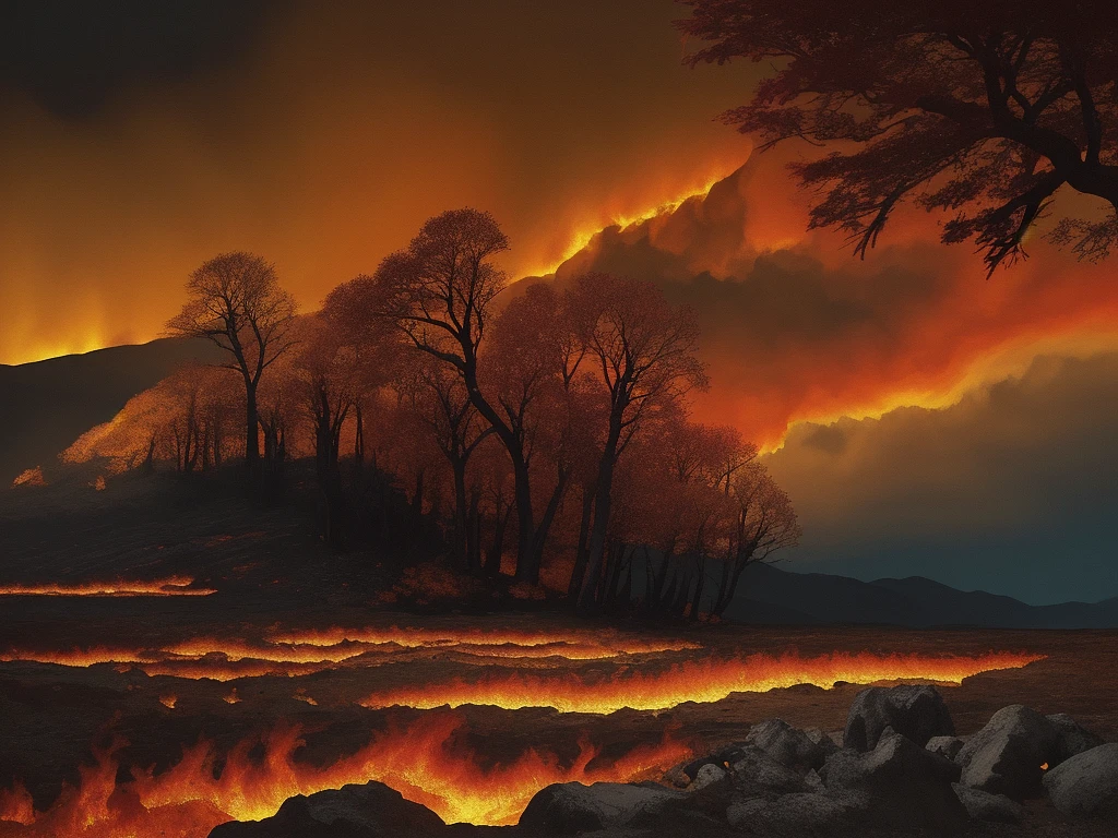 a breathtaking background the image is a fiery blaze, with flames licking at the edges of the scene. The colors are muted, with shades of orange, yellow, and red dominating the palette. To the left of the woman, a dark and ominous landscape stretches out, with twisted trees and jagged rocks looming in the distance. The sky above is a deep, foreboding grey, with clouds that seem to swirl and twist in every direction. The overall effect is one of intense drama and passion, as if the woman is channeling the raw energy of the flames into her very being.