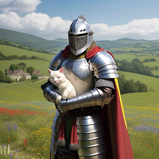 A medieval knight in full armor is standing in a picturesque countryside scene, holding a content and fluffy cat in his arms. The knight is wearing a detailed, shiny metal helmet and armor with a vibrant red and yellow cape draped over his shoulders. The background features rolling green hills, colorful wildflowers, and ancient stone buildings scattered across the landscape under a bright, clear sky. The scene is peaceful and serene, with a mix of medieval and fantasy elements. , majestic, sweeping seascapes, photorealistic representation, graceful balance, wimmelbilder, orange --ar 72:101 --stylize 750 --v 6