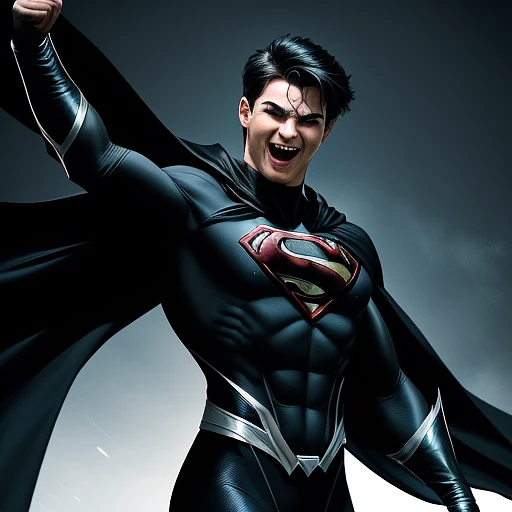 Generate an image of a male superhero exuberantly celebrating a triumph, dressed in a sleek black costume. The costume should prominently feature a 'CC' logo on the chest, symbolizing strength and identity. Enhance the superhero's appearance with a flowing black cape, adding a touch of dramatic flair to the overall composition. Equip the superhero with vibrant, phosphorescent blue glasses that emit a cool glow, contributing to a futuristic and dynamic aesthetic. Capture the celebratory moment with dynamic poses, showcasing the superhero's confidence and achievement. Ensure the facial expression reflects joy and success. Craft a visually engaging background that complements the superhero's persona. The resulting image should radiate a victorious and contemporary superhero ambiance.