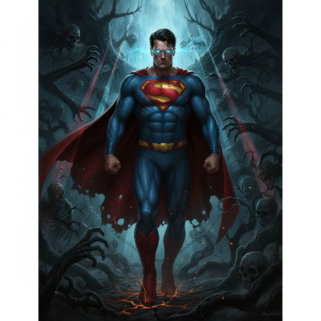 Superman, in dynamic, atmosphere of darkness and horror, dramatic light, highly detailed, packed with hidden details, hyper realistic, in the style of wallpaper portraits, colorful realism, realistic attention to detail, highly detailed, colorful realism, UHD, 8K
