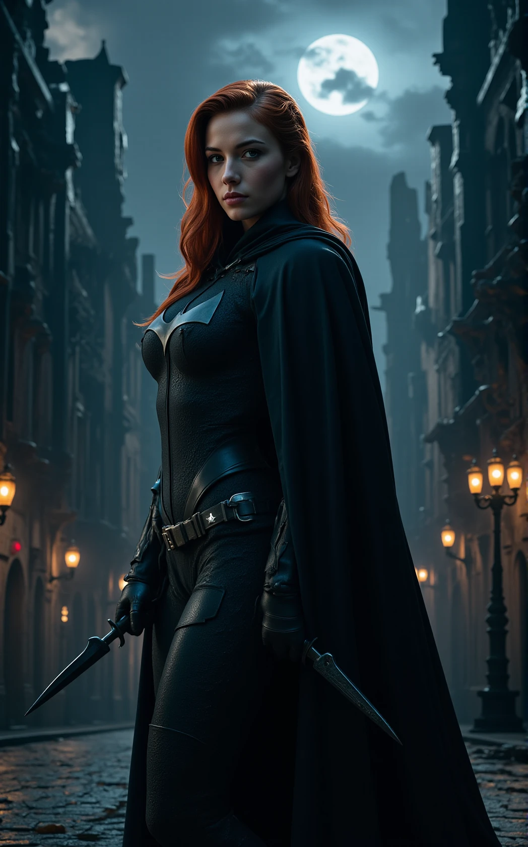 In the heart of a dark fantasy city, where the shadows whisper secrets and the moonlight barely pierces the gloom, Batgirl emerges as a mysterious and formidable rogue. Her presence is almost spectral, blending seamlessly with the darkness that envelops the city's labyrinthine alleys and towering, gothic spires. She is poised and ready, a silhouette of stealth and agility, embodying the essence of a shadowy predator. Batgirl's recognizable hair cascades down her back, a vibrant contrast to the surrounding darkness, with its deep auburn hues glinting subtly in the faint light. Her eyes, sharp and focused, gleam with determination and cunning, reflecting her readiness to strike at any moment. Her outfit is a masterful blend of stealth and style, designed to aid her movements while leaving just enough to the imagination. The armor she wears is a sleek, form-fitting ensemble that combines dark, matte leather with reinforced, metallic plates strategically placed for protection without sacrificing agility. The intricate patterns etched into the metal catch the dim light, hinting at a craftsmanship that is both ancient and otherworldly. In her hands, she wields twin daggers, their blades honed to perfection, gleaming with an almost sinister edge. These are not mere weapons but extensions of her very being, tools of her trade that she handles with unparalleled skill and precision. The city around her is a sprawling metropolis of dark fantasy, its architecture a mix of crumbling ruins and towering, ornate structures that reach into the night sky. The streets are slick with the recent rain, reflecting the eerie glow of distant lanterns and the occasional flash of lightning that illuminates the dense, ominous clouds above. The air is thick with the scent of damp stone and the faint, lingering mist that curls around her ankles, adding to the sense of mystery and danger that surrounds her. Every element of this scene, from Batgirl's poised stance to the intricate details of her surroundings, paints a vivid picture of a world where danger and beauty coexist, and where she is the shadowy guardian of the night.