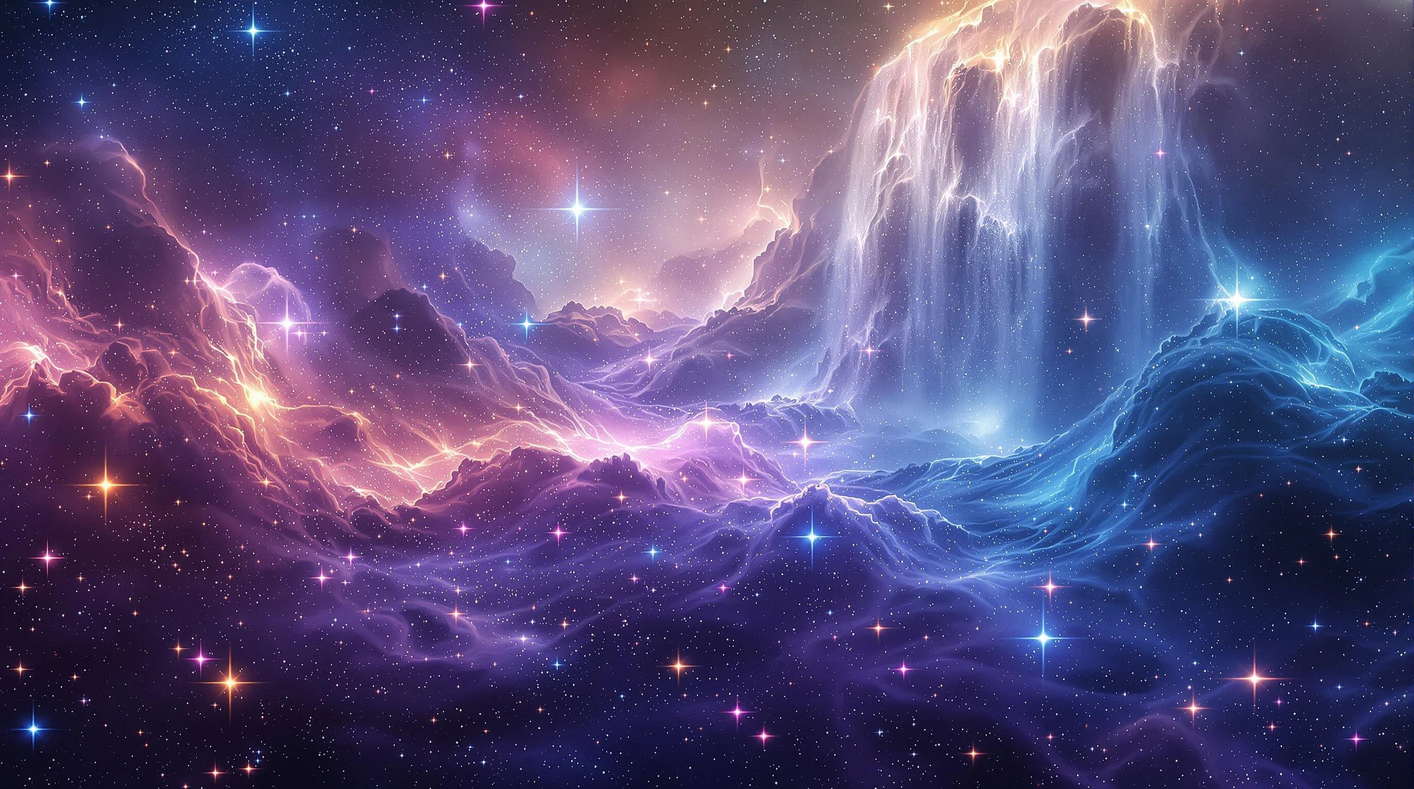a waterfall landscape in a close up view, made with nebulas the gaz, stars , stars cluster and dust ressembling falling water from a beautiful celestial cosmic background hypper realistic