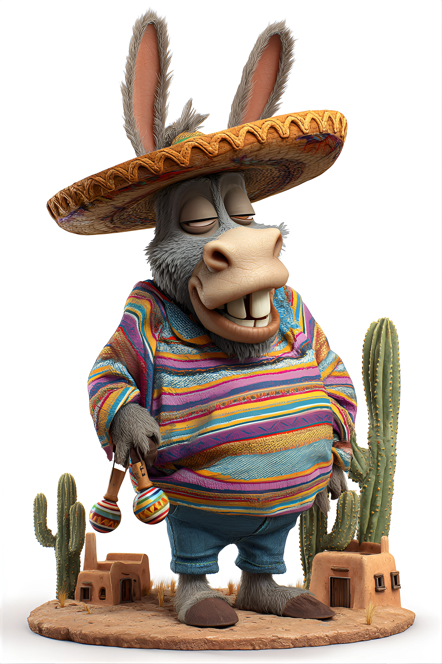 funny caricature, goofy donkey character, mexican ethnicity, 7 years old, lazy, friendly, stubborn, long face with exaggerated ears and a potbelly, exaggerated caricature, barrel-shaped body type, enormous ears, droopy eyes, buck teeth, sleepy smile expression, the donkey is wearing a colorful serape and a small sombrero, accessorized with maracas hanging from its neck, lounging pose