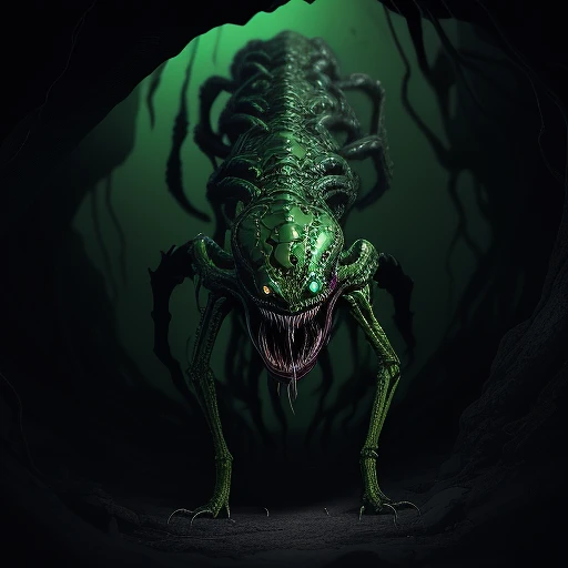 Full body photo of a scary alien creature that looks like a humanoid centipede with venom coming out from its mouth emerging from a dark cave, green deadly eyes, horror, dark golden skin, intricate design and details, dramatic lighting, photorealistic, cinematic