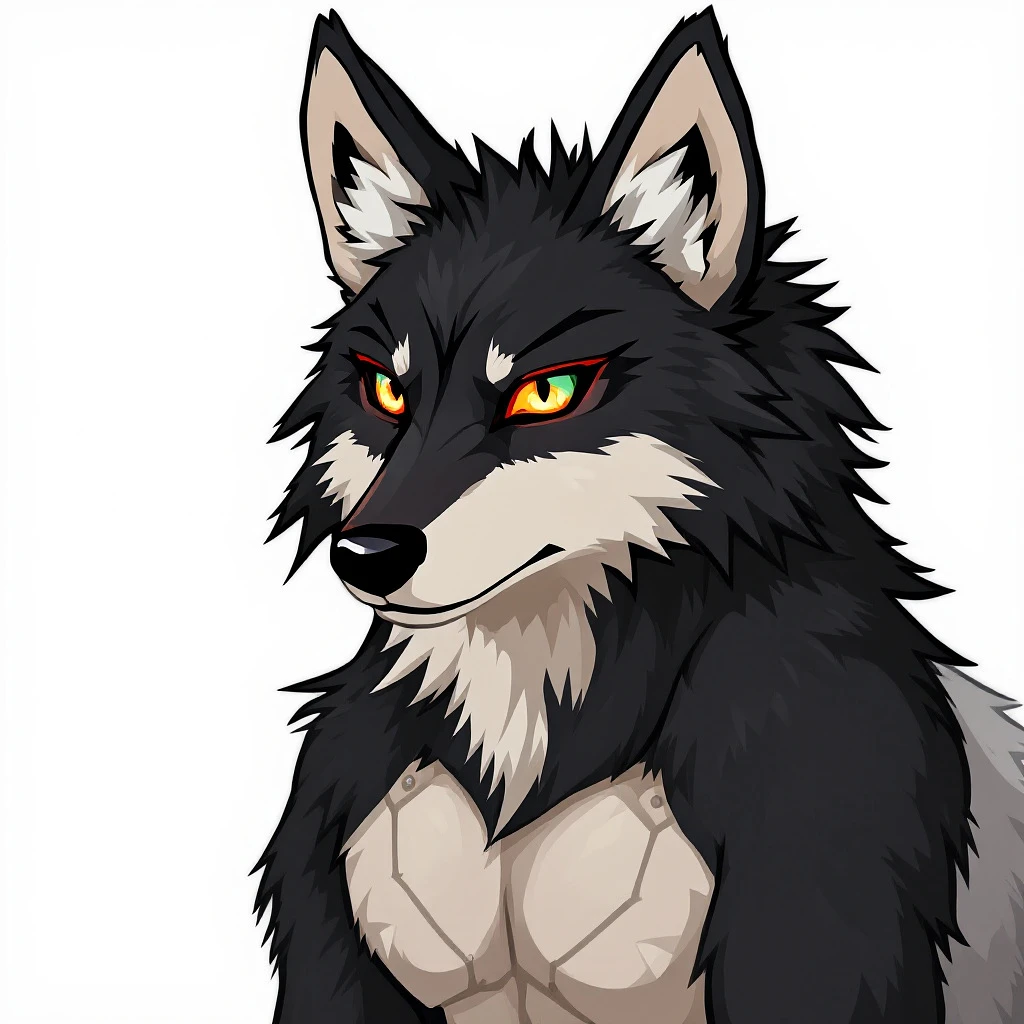 Black Wolf fursona with dark gray highlights. It has extra wolf ears. It also has another pair of extra eyes which contain an ombre of mostly green, some orange, and a little bit of red. It has a plain metal chest making a v-neck shape without any screws or rivets