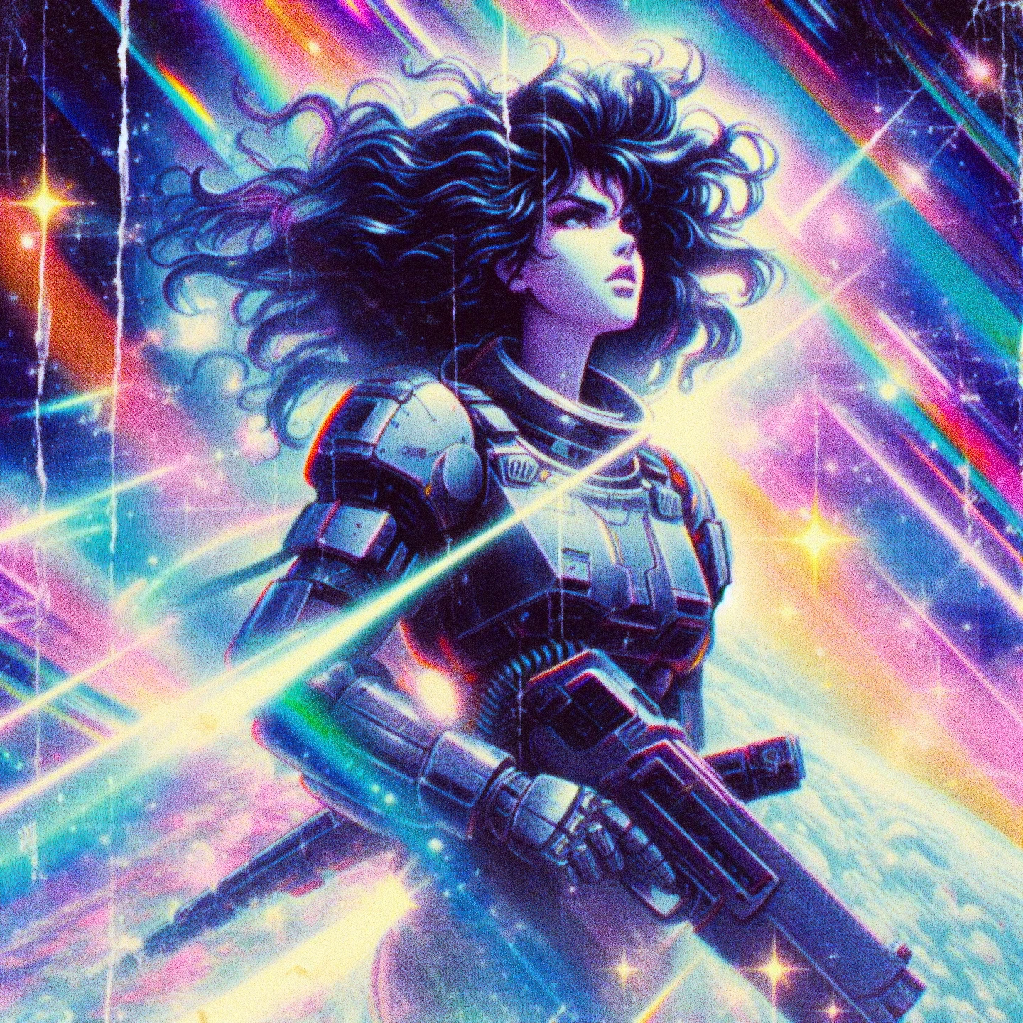 Really old vhs reproduction of a 80’s sci fi anime, A brave female pilot got lost and it’s floating aimlessly, full body away from camera. Prism lights and flares, akira style brush and shadows, high saturation, long shot. Pychedelic flares.