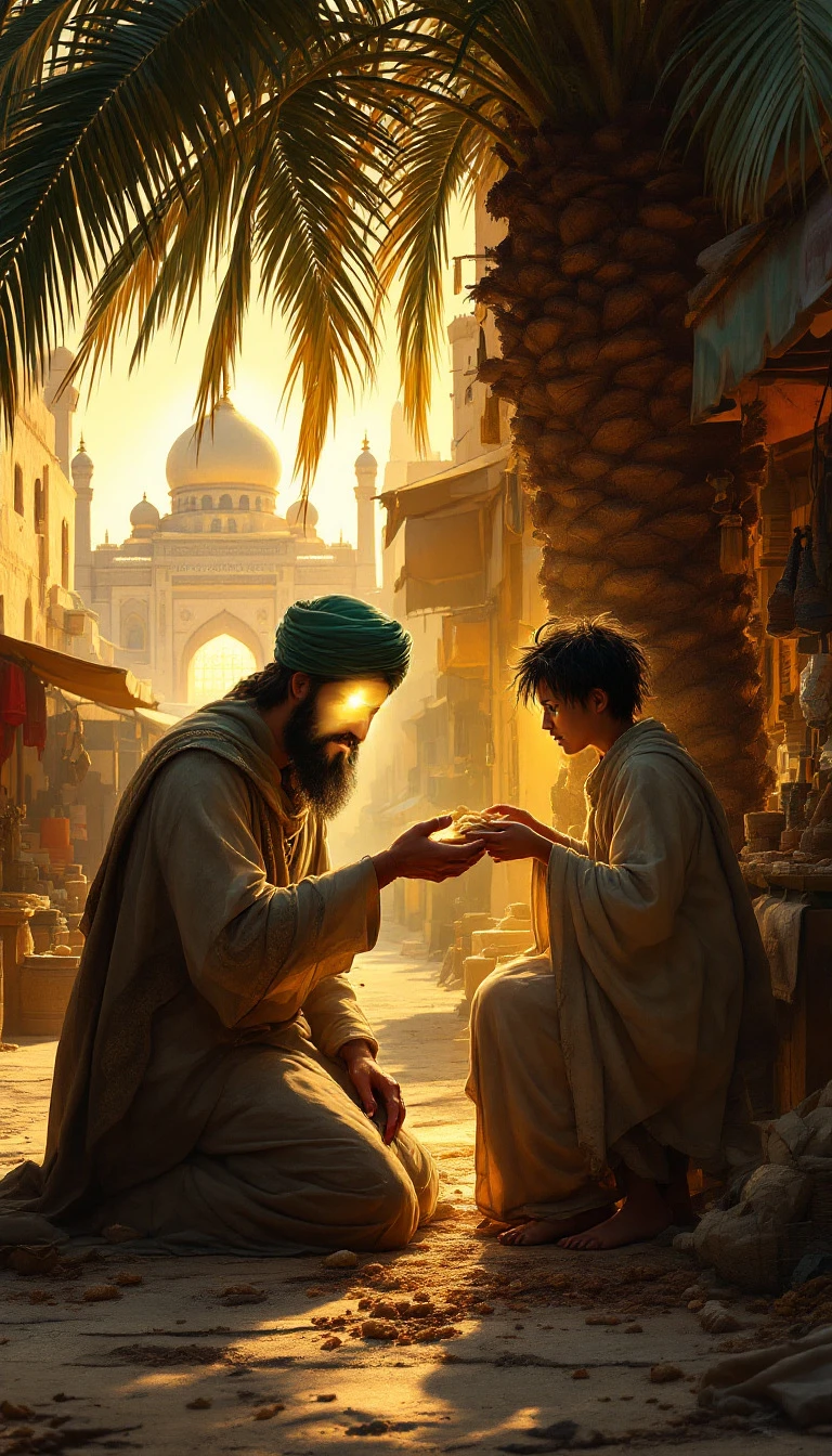 In a quiet corner of Kufa’s bustling market, under the shade of a tall palm tree, depict a heartfelt moment. Imam Ali, a tall figure with a green turban and gray robe, his face completely replaced by a radiant, blinding golden-white light, so intense that it forms a glowing orb where his face should be, with no facial features, eyes, or expressions visible at all, kneels to give bread to the Orphan, a thin child with tattered clothes, messy black hair, and sad but hopeful eyes. The sunlight casts warm, earthy tones of brown and gold, creating a soft halo around Imam Ali, emphasizing his divine kindness. The background shows the market’s narrow, dusty streets with mud-brick buildings and colorful stalls, while the Kufa Mosque glows with a soft golden light in the distance. "