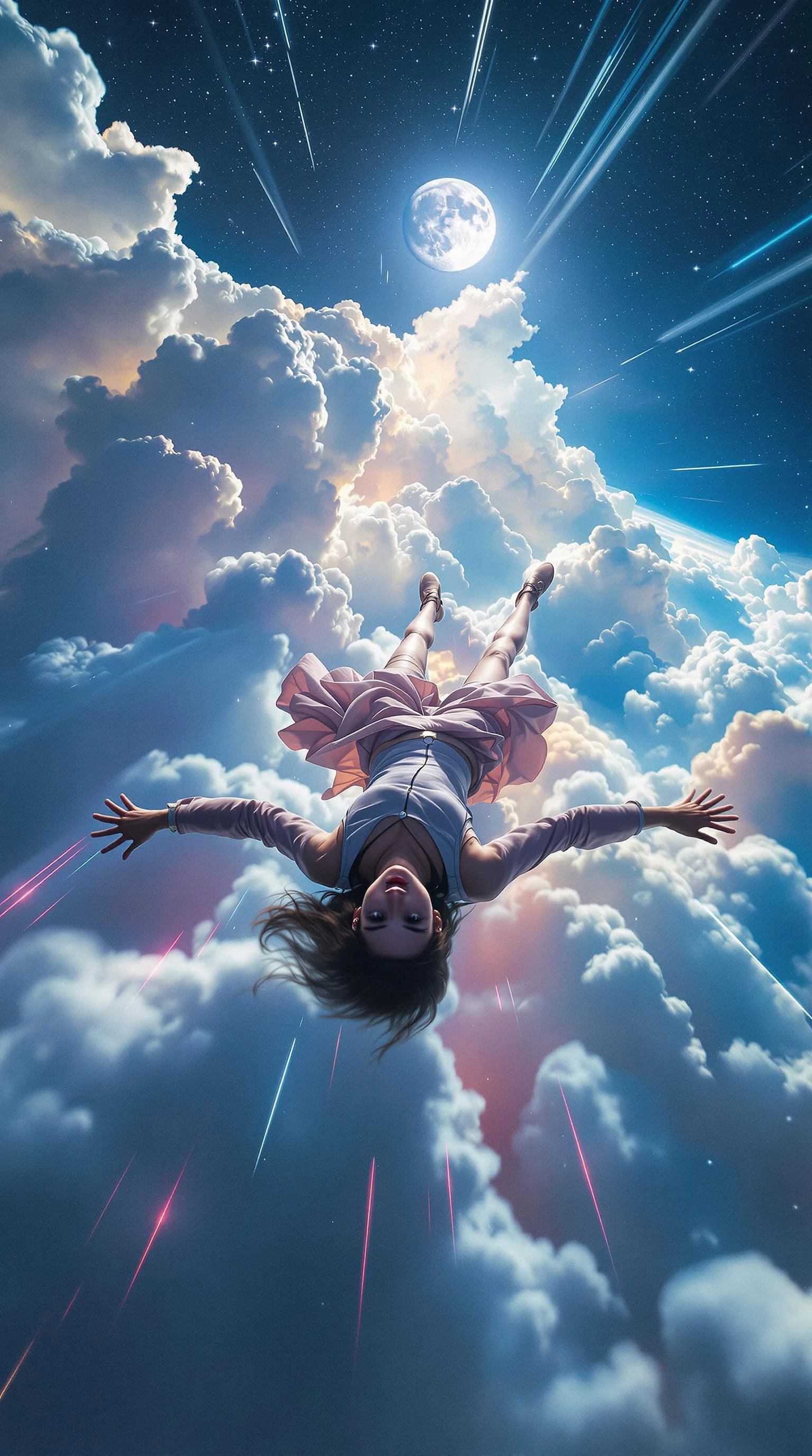 A fast aerial tracking shot from the perspective of a drone captures a surreal dream sequence of a woman dressed in street dance attire flying at high speed in a prone position. She effortlessly glides between the clouds, her body fully extended with arms stretched out to the sides, legs slightly apart, and her head forward, capturing the sensation of smooth horizontal flight. Her clothes billow in the wind as the camera closely tracks from a slightly higher angle, moving from left rear to right rear, maintaining a continuous view of the prone position as the character swiftly traverses the scene. The environment is dynamic, rapidly changing, with colorful clouds below, white clouds streaking by in the background, a large moon hanging high in the distance, and a sparkling night sky surrounding, with motion blur and light trails enhancing the sense of speed and fluidity. Rapid movement.