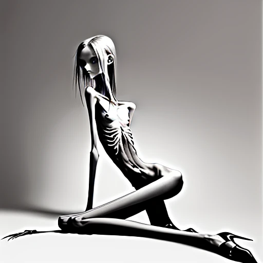 extreme skinny slender anorexic girl very skinny slender girl, with long curved claws, skinny legs in high heels , lying position