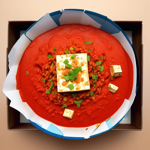 "Give me a picture of a koshary dish with tofu and tomato sauce on top, shot from an overhead angle, presented in a tasty and modern 'to-go' paper container