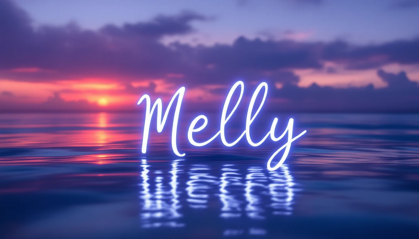 Design a romantic banner with an enchanting sunset over a calm ocean. The background should feature gradient hues of orange, pink, and purple reflecting off the water. The name 'Melly' should remain in the same cursive font, filled with a soft white that glows against the vibrant backdrop. A subtle reflection of the text on the water can add a unique touch without complicating the design.