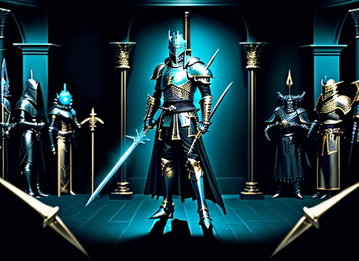 black knight with gold sword at his side in a darck room. with monsters surrounding him. glowing cyan eyes all arownd him