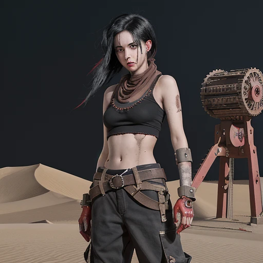 absurdres, highres, emo girl_ (Black Hair with red streaks) , Red Eyes, post apocalyptic mechanical wasteland, sand dunes, ancient machinery, giant gears, cogs, bolts, sandstorm, dystopian, cargo pants, tank top, bandana, belt, straps, buckles, leather bands