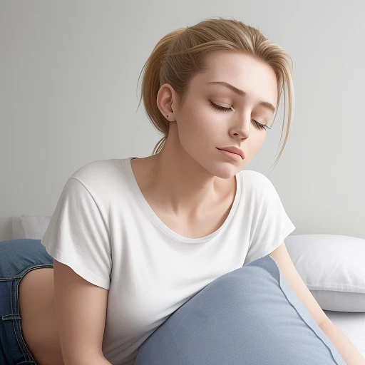 The image shows a woman laying on top of a bed next to a pillow, with a wall in the background. She is wearing a white t-shirt and blue jeans, and her hair is pulled back in a ponytail. Her eyes are closed and her lips are slightly parted, giving her a peaceful and relaxed look.