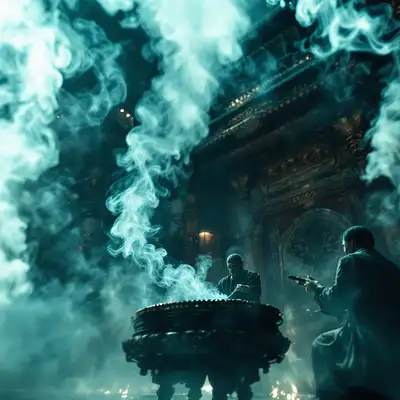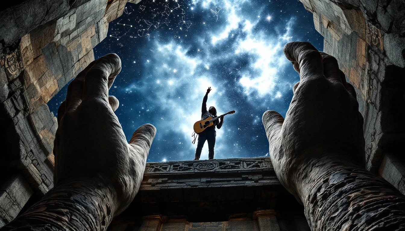 The Sky Framed by Colossal Stone Hands (Low-Angle Shot – Deep Depth of Field) The camera is placed between two gigantic stone hands, reaching up toward the temple’s cracked ceiling. Above, a Native American guitarist stands on a high beam, silhouetted against an unreal cosmic sky. The ancient hands seem to "hold" the sky, mirroring the musician’s pose as he raises his guitar. The ceiling shifts, revealing constellations forming ancient tribal symbols, pulsating in rhythm with the performance.