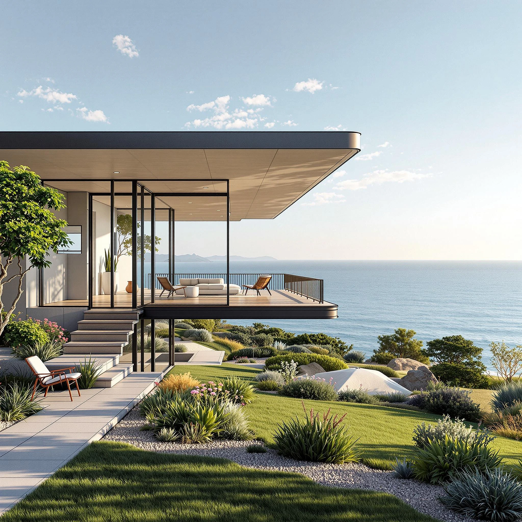 Hyper realistic eye level exterior photo of a mid century modern style house overlooking the ocean, daylight, indirect lighting, AD magazine, Frank Lloyd, Eames, Mies van der Rohe