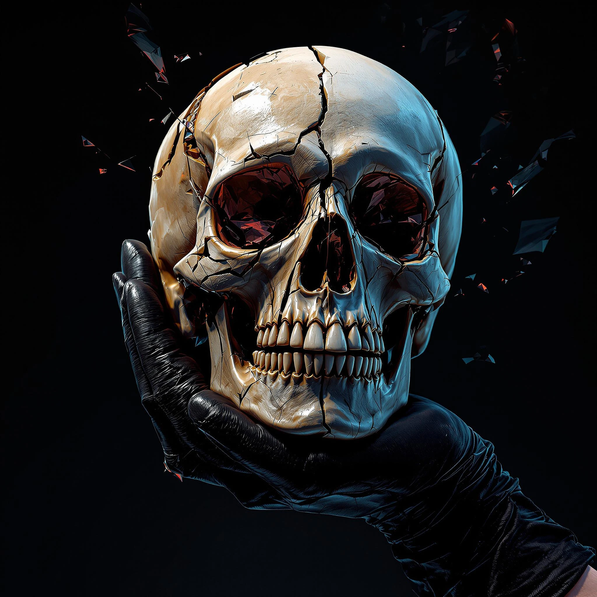 3d realistic black gloved hand holding a crushed skull with a dark abstract colored background, hyper realism, high detail, 3d illustration, 8k