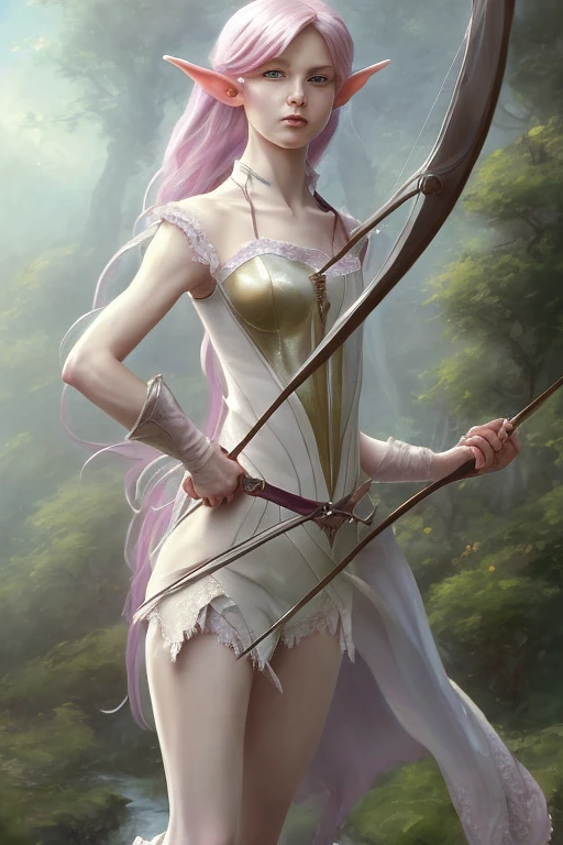 Daniel F. Gerhartz painting with a touch of manga style, full-body, full-length young adult female elf rogue with flowing pastel pink hair, pointed ears, flawless complexion, breeches, leather corset, and a cloak, with bow and arrow, dynamic pose, cinematic camera angles, and lighting, volumetric lighting, digital painting, concept art, smooth, sharp focus, in the style of Alphonse Mucha, Artgerm, Stanley Lau