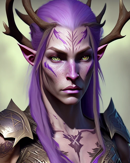 portrait painting of an angry elven eladrin young woman warrior with light purple hair and freckles and tribal tattoos on her cheekbones and deer antlers on forehead, body builder, foliage armor, ultra realistic, concept art, intricate details, eerie, highly detailed, photorealistic, octane render, 8 k, unreal engine. art by artgerm and greg rutkowski and charlie bowater and magali villeneuve and alphonse mucha