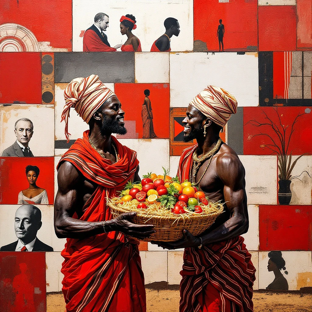 A painting of two African men in traditional carrying food, with the background being an abstract collage made from red and white squares, including images representing historical figures such as Dali, Magritte, and African crafts, with red fabric woven into it and red stripes on their . The overall style is very colorful and expressive. It's a vibrant scene that captures attention.