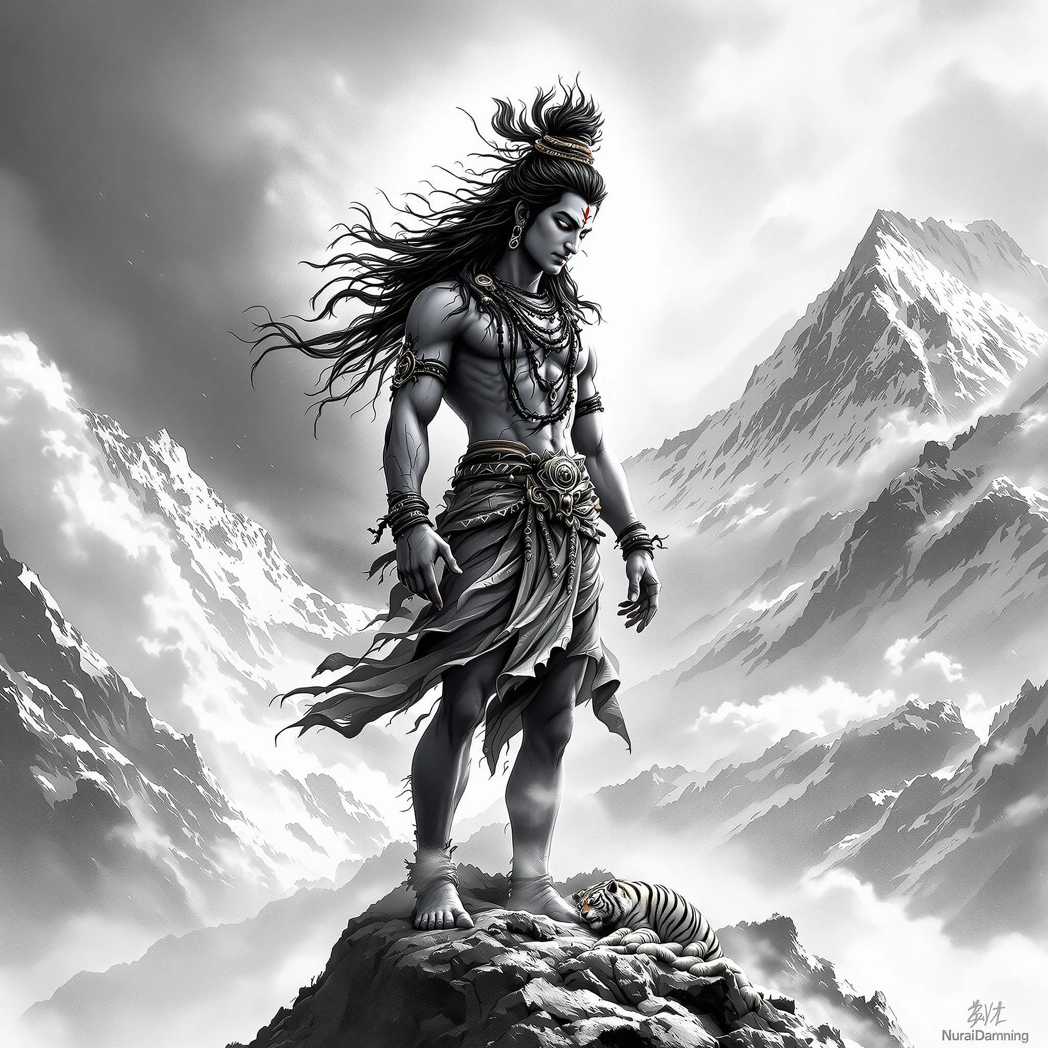 Lord Shiva in a dramatic black-and-white rendering, standing tall on Mount Kailash with his body covered in ash, gazing down with calm wisdom, the Ganga flowing from his hair and the tiger skin beneath him.