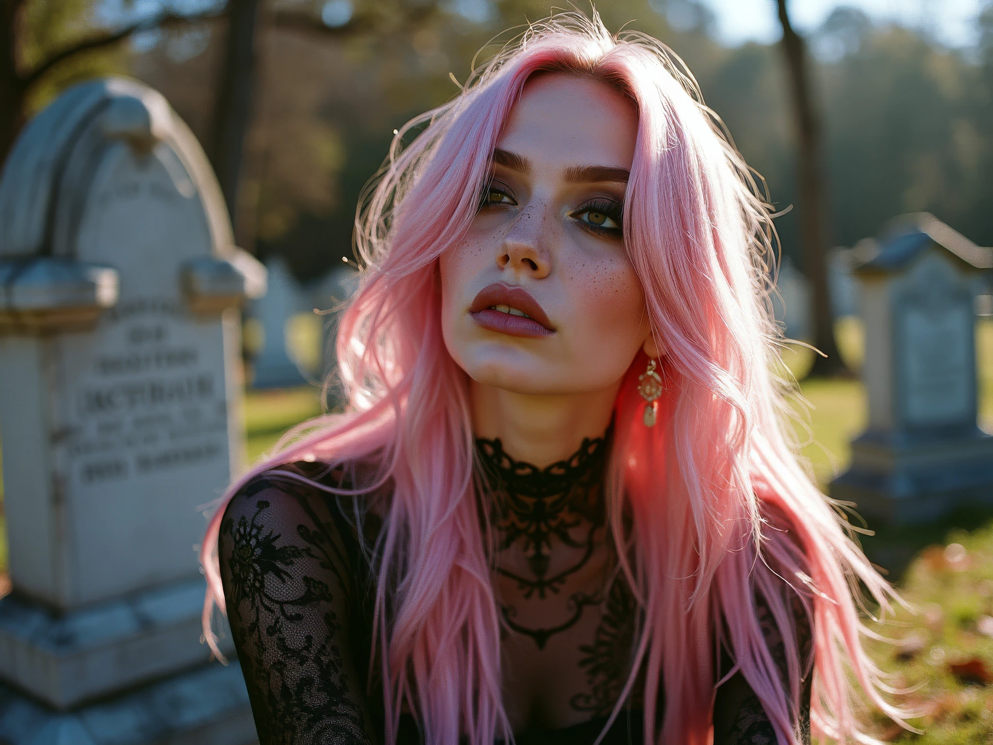 black metal inspired pastel goth with a focus on pale pink sitting on a tombstone, intense direct sunlight is hitting her face from the side::4. 5, kodak portra 800::3 --ar 9:16 --v 5. 1 --no eyebrows::3