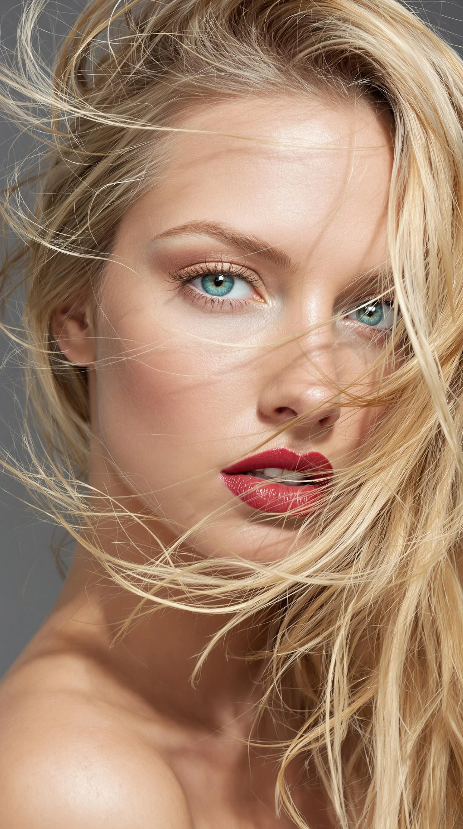"The image is a striking close-up portrait of a model with lustrous, tousled strawberry blonde hair cascading like a silken waterfall over her slender shoulders. Her sun kissed skin radiates a gentle luminescence, akin to moonlight softly caressing a winter landscape. Her bright, vivid green eyes resemble twin emeralds, deep and reflective, while her lush lips are painted a soft red, accentuating her ethereal beauty. A gust of wind lifts her hair adding an element of serene dynamism to the otherwise tranquil scene. The background is a muted slate grey, allowing her features to be the focus. "