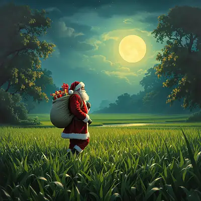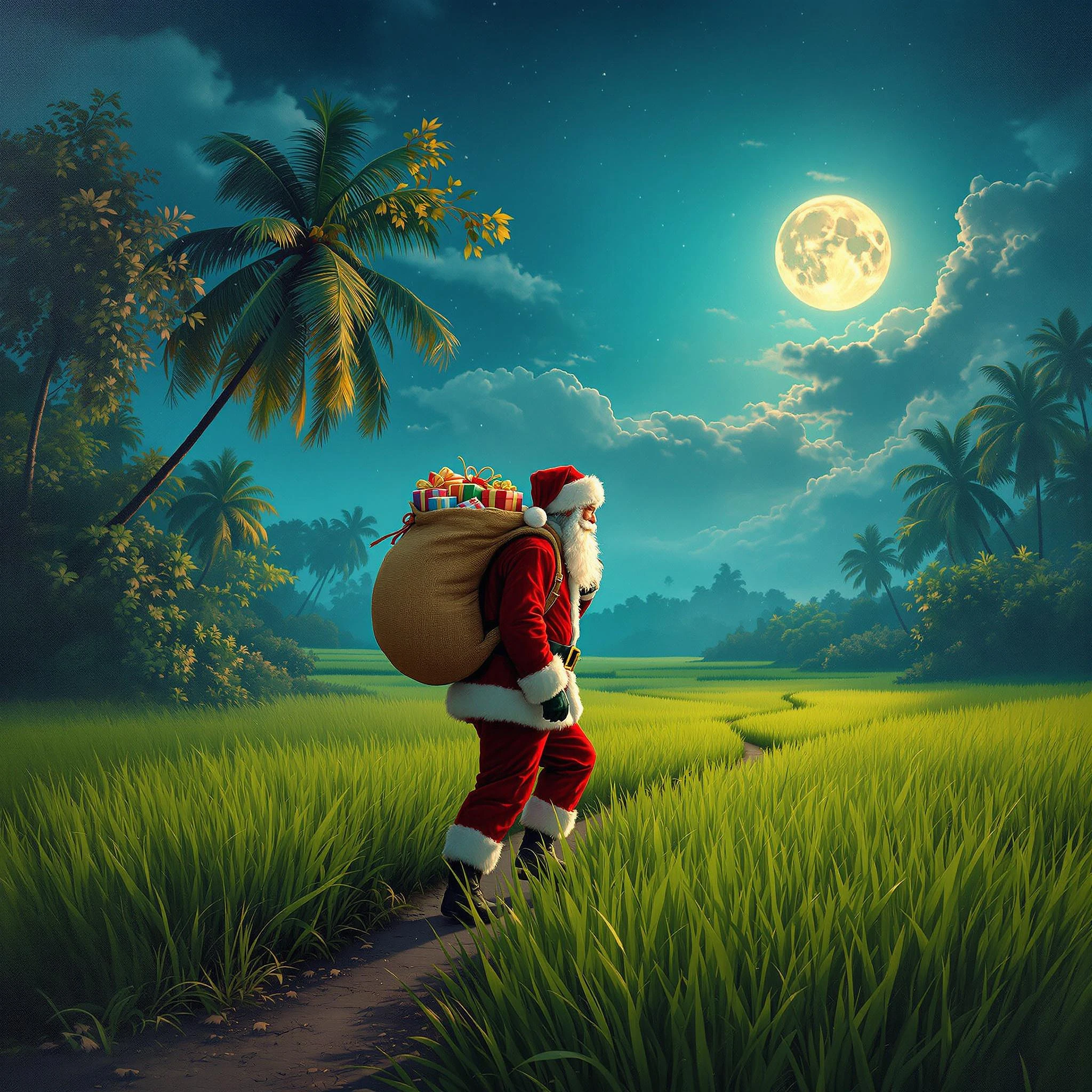 Photo realistic image of Santa Claus, carrying a sack of gifts, strolls through a serene Kerala paddy field under the glow of a full moon. The familiar figure contrasts beautifully against the lush green backdrop, his traditional red and white attire shining in the moonlight. The scene, depicted in an exquisitely detailed painting, captures the magic of Christmas and the enchanting beauty of nature. Rich, vibrant colors and intricate textures bring this heartwarming image to life, evoking a sense of wonder and joy. 8k