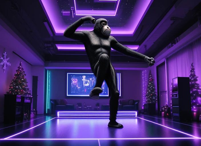 Image cyber punk futurism Christmas living room with dance floor with an ape standing on the dance floor