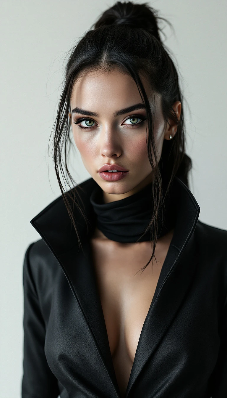 A striking and stylized portrait of a fashionable Scandinavian model. She's posed against a stark white backdrop, showcasing a bold and avant-garde outfit, with an intense and enigmatic look. Her sharp features and precise angles create a sense of high fashion and dramatic flair. The image is sleek, minimal, and influenced by contemporary fashion photography.