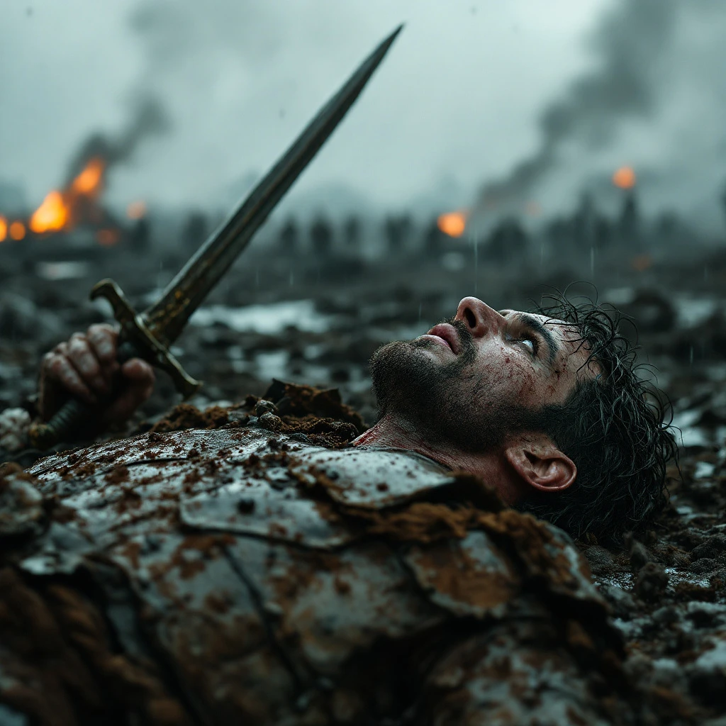 A fallen warrior lies on a muddy battlefield, his armor dented and covered in grime, his sword barely clutched in his trembling hand. His eyes, hollow and lost, stare into the overcast sky as rain falls over the war-torn landscape. Smoke rises in the background from burning ruins, silhouettes of soldiers still clashing in the distance. The air is thick with sorrow and despair. The color palette is muted—grays, browns, and faded reds—emphasizing the hopelessness of the scene. The warrior’s face is smeared with dirt and blood, his spirit broken, as if realizing that victory or survival no longer matters. A haunting, cinematic composition with soft, diffused lighting, evoking a sense of loss and futility.