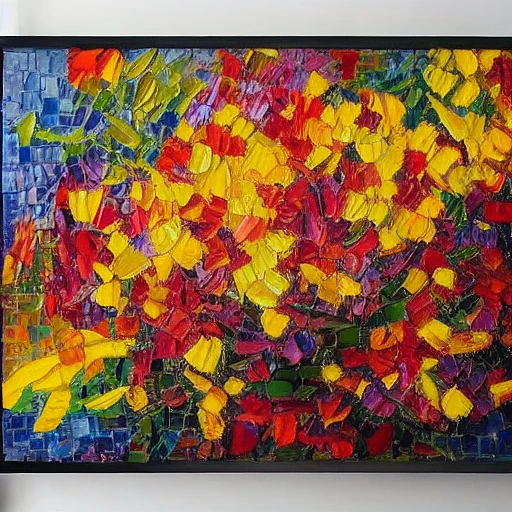 high detailed oil painting, thick texture, pallet knife, bright colourful, big mosaic face surrounded by flowers