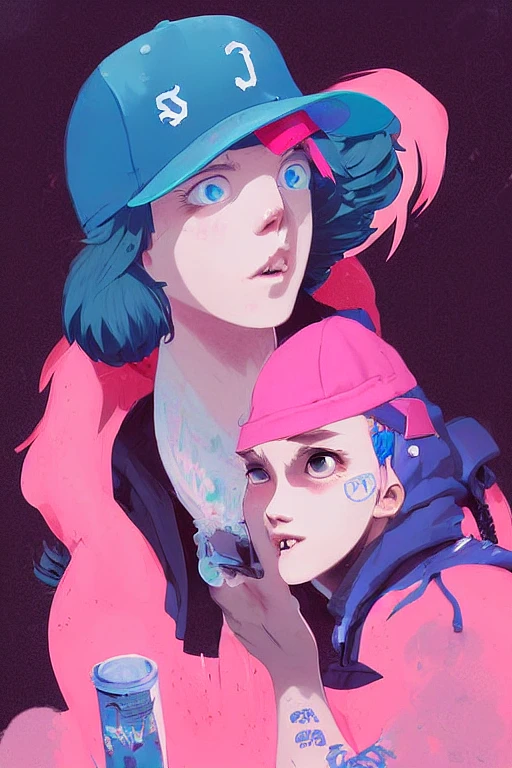 Highly detailed closeup portrait of a sewer punk pretty female teen witch. wearing baseball cap pink and blue hair , by atey ghailan, by greg rutkowski, by greg tocchini, by james gilleard, by joe fenton, by kaethe butcher, grunge aesthetic