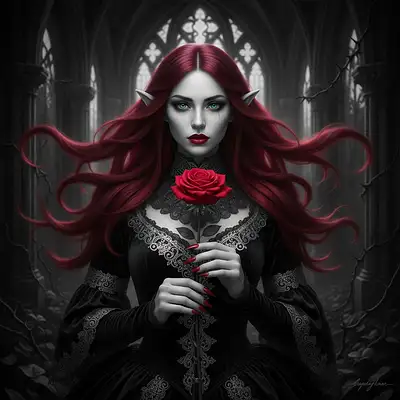 black and white with added colour a woman elf , captivating soft green eyes , red fluid wavy hair ruby red lips and fingernails holding red rose , gothic attire, black and white, , hyper realistic, highly detailed, . . . . . . . . . . . . . . . . . .