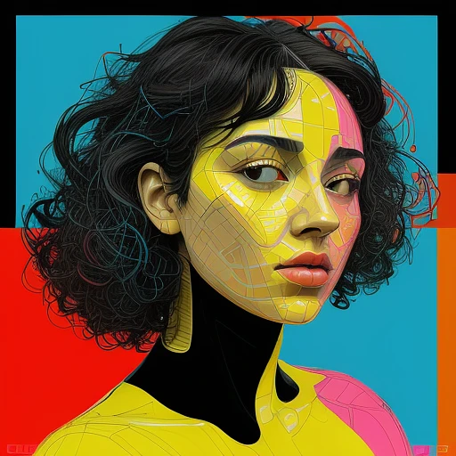 female face with curly thick hair, geometric abstract portrait, bright vibrant colorful, gritty, cybernetics, digital ui, abstract blocks, by Guy Denning, Russ Mills, chromatic, color blocking! , octane, object centered, oil on canvas, symmetrical, Red, concept art, abstract, trending on artstation, Pablo Picasso, Gustav Klimt, trippy, high texture, --c 100 --s 1000 --ar 3:4 --style raw --q 2 --s 750