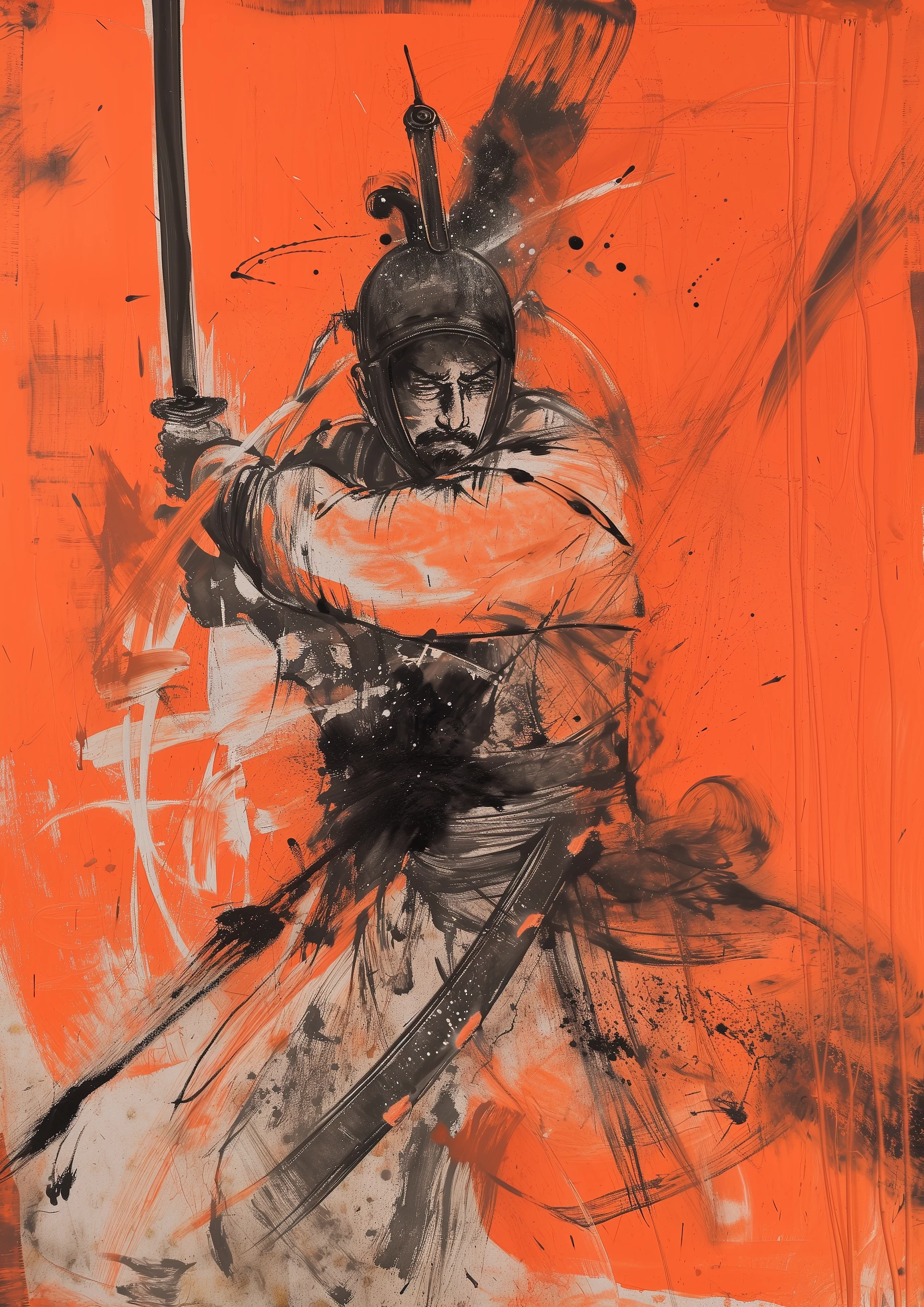 a chinese ancient man wearing a helmet holding a sword, in the style of zeen chin, video, gutai group, cultural satire graffiti, hajime yatate, dau al set, dark orange --ar 91:128 --v 6. 0